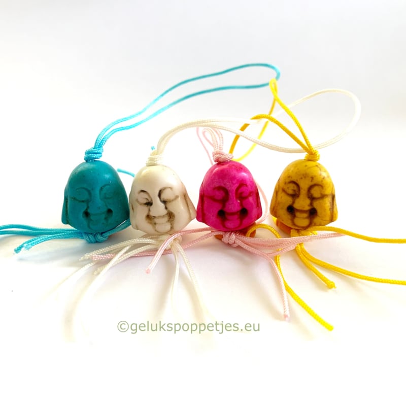 Boeddha hoofd gelukspoppetje in gemengde kleur. Grootte ongeveer 27 breed x 29 mm lang. Deze worden niet voor de sleutelhangers gebruikt.