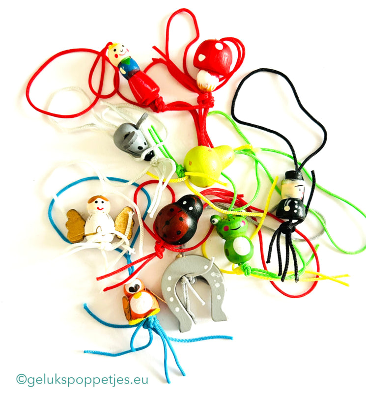 Mix van 10 verschillende gelukspoppetjes. Iedere mix kan anders zijn, dus we kunnen geen plaatje laten zien van wat er precies wordt geleverd. Er kan een gelukspoppetje van het plaatje in zitten, maar dat hoeft niet, we hebben meer dan 200 verschillende dus het blijft een verassing!