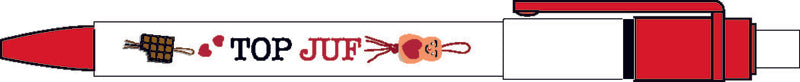 Gelukspoppetjes pen voor je topjuf! Een fijne blauw schrijvende pen met daarop de afbeeldingen van het gelukspoppetje met het hartje op de buik en het chocolade gelukspoppetje.