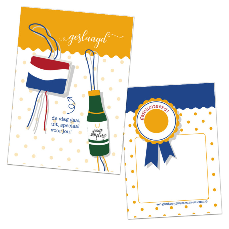 Gelukspoppetjes kaartje "GESLAAGD" met de geluksvlag en het geluksflesje. Uiteraard ook nog plaats om je gelukswens op te schrijven voor de geslaagde.