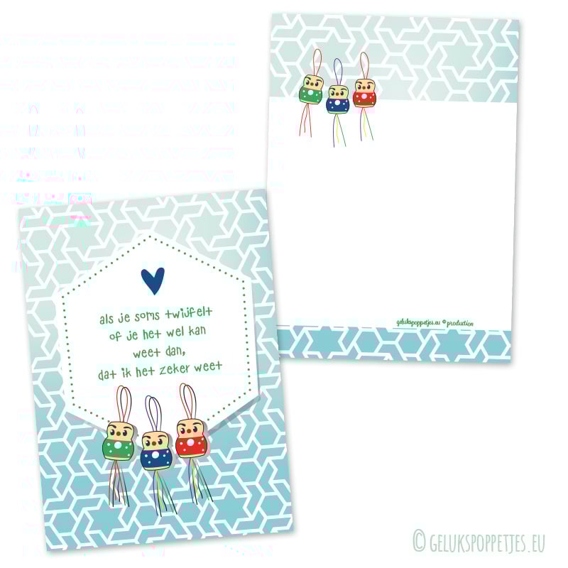 Als je soms twijfelt... gelukspoppetjes kaartje met de afbeelding van de "ouderwetse" gelukspoppetjes erop. Nog leuker om er een echt houten gelukspoppetje bij te bestellen en aan iemand te geven die wel een beetje geluk kan gebruiken.